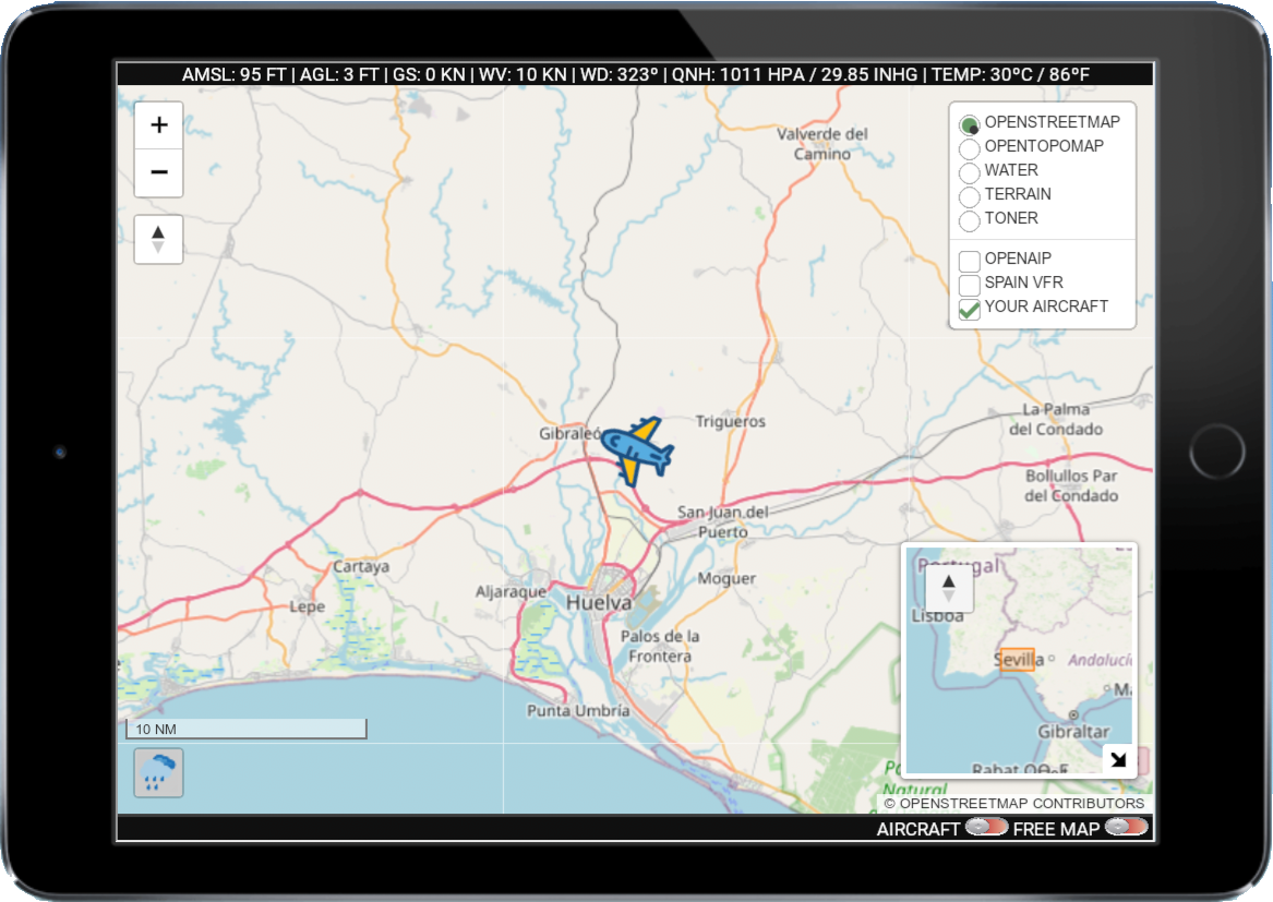 Si volamos VFR puro y no queremos que el mapa nos indique por donde vamos, podemos desactivar que el mapa nos siga desmarcando FREE MAP (abajo a la derecha) y también podemos ocultar el avión desmarcando Your Aircraft (en el menú de capas). De este modo podremos consultar el mapa libremente y no se nos indicará por dónde estamos volando, por lo que no nos ayudará en nuestras sesiones de práctica VFR.